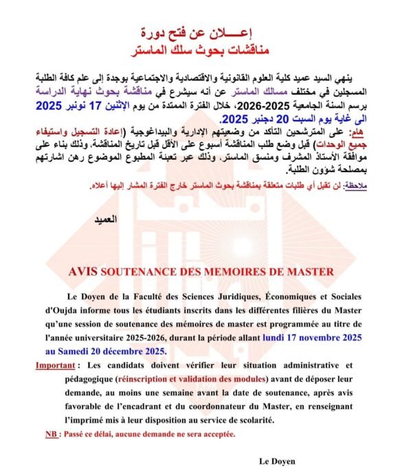 اعلانات هام بشأن الفترة الاستدراكية لمناقشة رسائل الماستر كتبه dcri 2025-10-17 2025-10-17 0 تعليقات 1.1K قد تعجبك أيضاً إعلان عن نتائج الانتقاء الأولي للمترشحين لماستر قانون العقود والأنظمة العقارية ـ وكذا برمجة الاختبار الكتابي برسم الموسم الجامعي 2025ـــ2026. إعلان عن افتتاح التسجيل بسلك ماستر قانون العقود والأنظمة العقارية dcri المقالة السابقة إعلان عن نتائج الانتقاء الأولي للمترشحين لماستر قانون العقود والأنظمة العقارية ـ وكذا برمجة الاختبار الكتابي برسم الموسم الجامعي 2025ـــ2026. قد تعجبك أيضاً إعلان عن نتائج الانتقاء الأولي للمترشحين لماستر قانون العقود والأنظمة العقارية ـ وكذا... 2025-10-11 إعلان عن افتتاح التسجيل بسلك ماستر قانون العقود والأنظمة العقارية 2025-09-27 اترك تعليقًا إلغاء الرد تقييمك: احفظ اسمي، البريد الإلكتروني، والموقع الإلكتروني في هذا المتصفح للمرة القادمة التي سأعلق فيها.